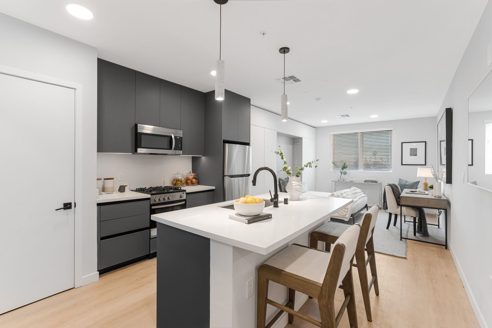 Centrally located in Koreatown, KANVAS is a brand new stunning seven-story apartment building that offers the ultimate luxury living experience. This modern spacious studio apartment features a modern kitchen with island, dishwasher, full-size washer/dryer, and even a built-in Murphy bedframe with built-in storage closets!